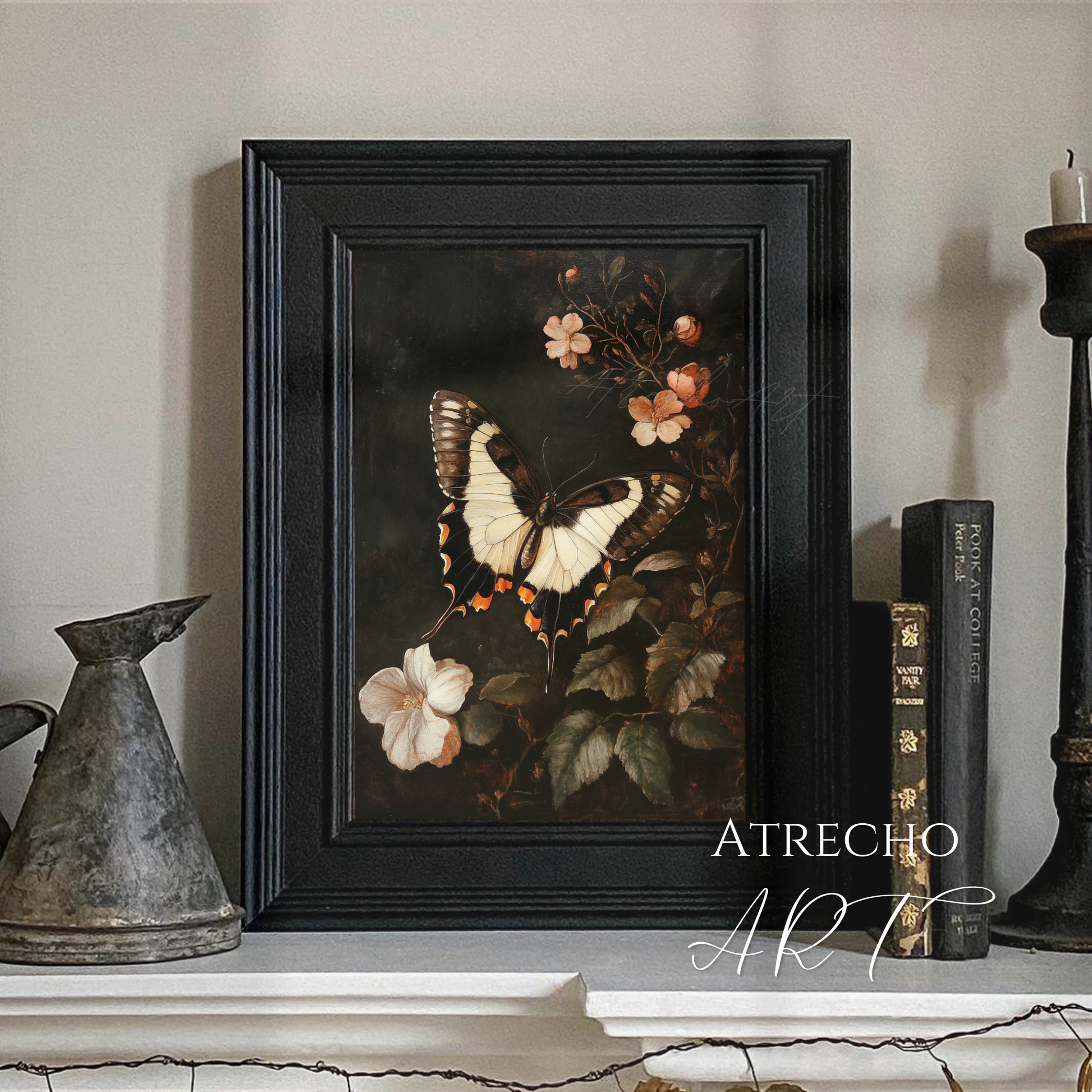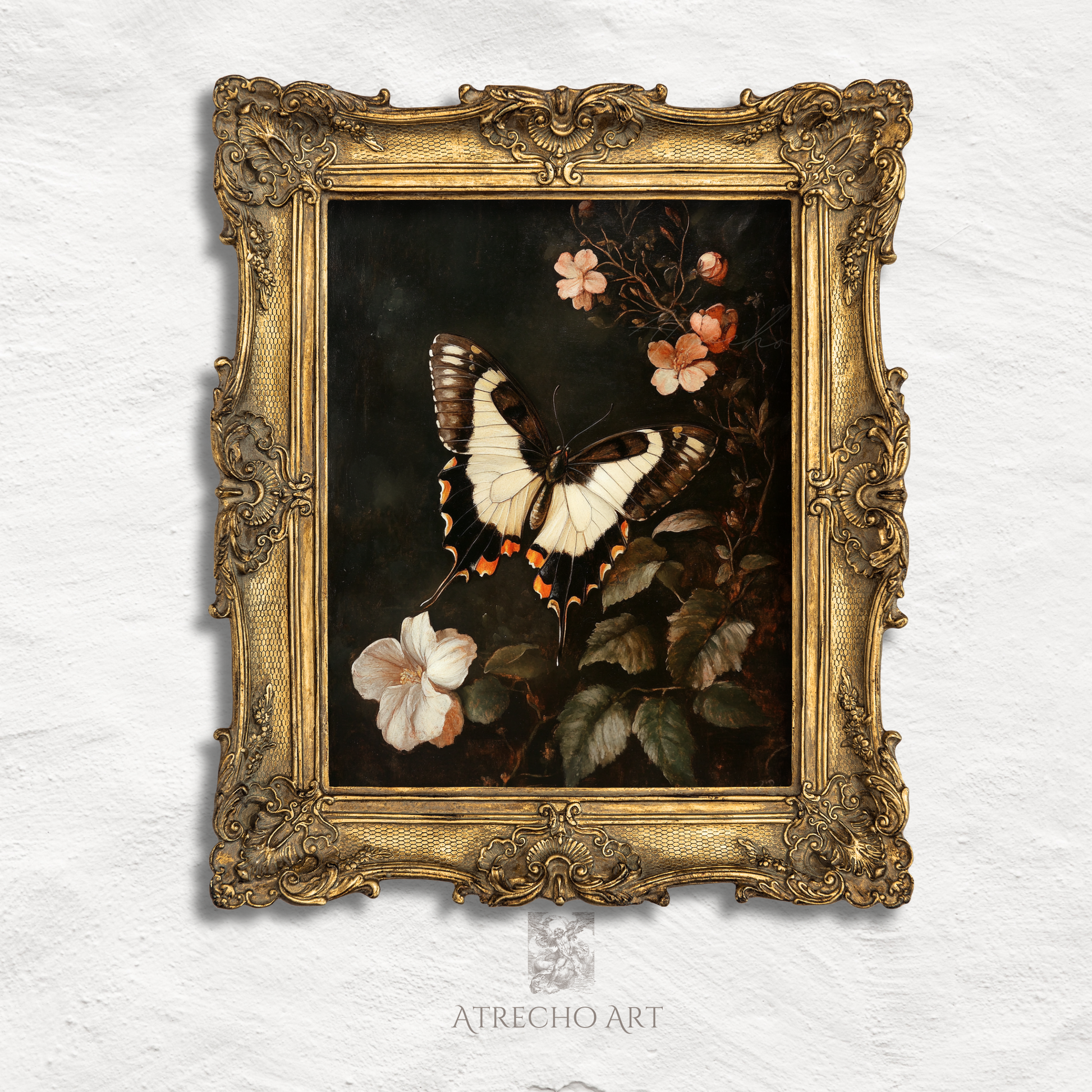This exquisite artwork draws inspiration from traditional European natural history illustrations, where butterflies symbolize transformation, renewal, and the delicate beauty of nature's cycles. The coral-colored blossoms represent new beginnings and natural abundance, while the dark, atmospheric background creates depth and drama reminiscent of antique botanical studies. This piece captures the cottagecore appreciation for nature's intricate details while appealing to those who love moody, sophisticated botanical art.
